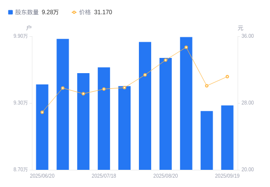 近一年(2024年9月20日至2025年9月19日),捷捷微电A股股东户数从6.82万户,增加至9.28万户,增幅35.98%,区间股价上涨82.07%。