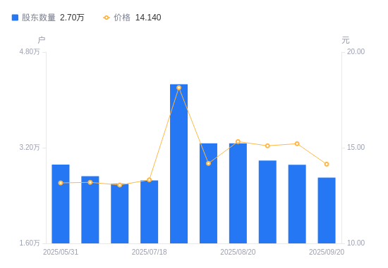 近一年(2024年9月30日至2025年9月10日),阳光乳业A股股东户数从2.26万户,增加至2.91万户,增幅28.84%,区间股价上涨42.82%。