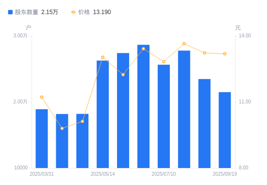 近一年(2024年9月30日至2025年9月19日),狄耐克A股股东户数从1.9万户,增加至2.15万户,增幅13.40%,区间股价上涨31.90%。