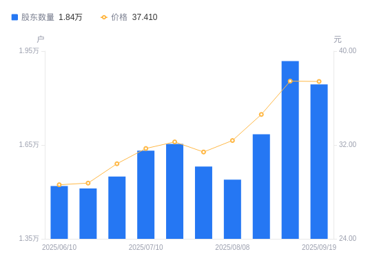 近一年(2024年9月30日至2025年9月19日),秋田微A股股东户数从1.75万户,增加至1.84万户,增幅5.14%,区间股价上涨36.31%。