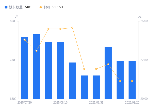 近一年(2024年9月30日至2025年9月19日),超越科技A股股东户数从1.03万户,减低至7481户,降幅27.45%,区间股价下跌6.66%。