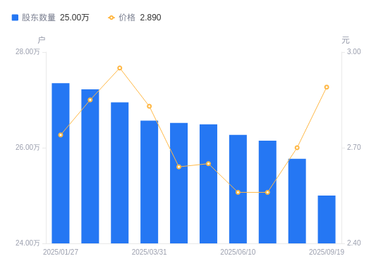 近一年(2024年9月20日至2025年9月19日),钒钛股份A股股东户数从27.54万户,减低至25万户,降幅9.22%,区间股价上涨25.11%。