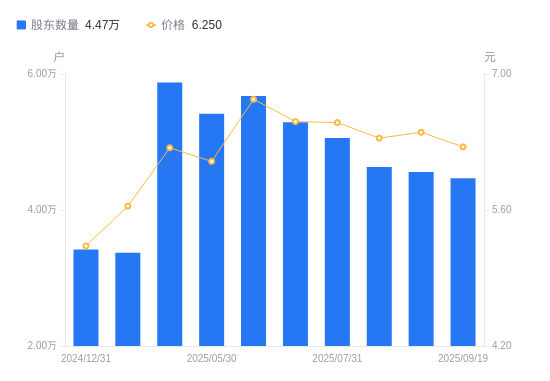 近一年(2024年9月30日至2025年9月19日),太阳电缆A股股东户数从3.56万户,增加至4.47万户,增幅25.42%,区间股价上涨25.00%。