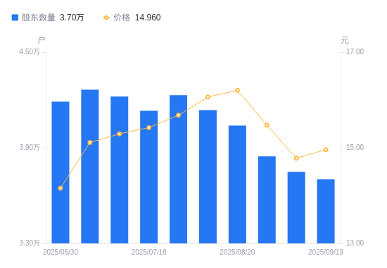 近一年(2024年9月20日至2025年9月19日),朗玛信息A股股东户数从4.25万户,减低至3.7万户,降幅12.86%,区间股价上涨34.96%。