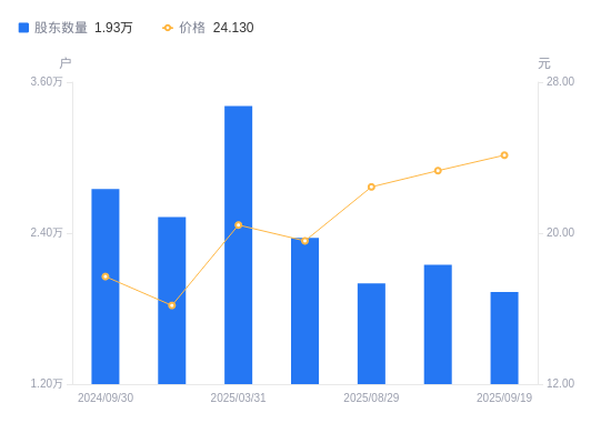 近一年(2024年9月30日至2025年9月19日),宇环数控A股股东户数从2.75万户,减低至1.93万户,降幅29.75%,区间股价上涨49.23%。