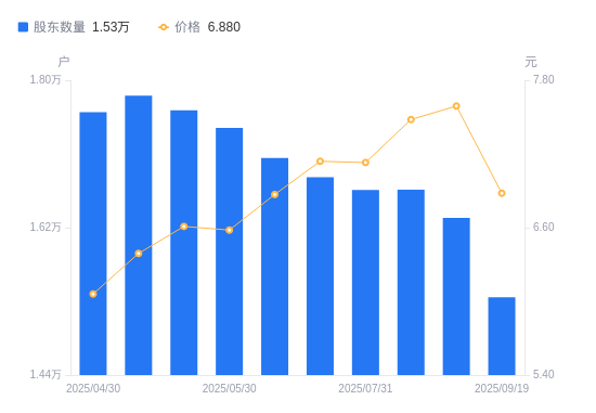 近一年(2024年9月20日至2025年9月19日),津膜科技A股股东户数从1.98万户,减低至1.53万户,降幅22.64%,区间股价上涨32.05%。