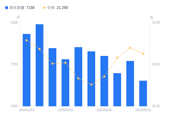 9月23日消息,数据显示,截至2025年9月19日,美新科技A股股东总户数为7158户,较上期(2025年9月10日)减少661户,降幅8.45%。公司最新A股总股本为1.19亿股,其中流通A股7335.92万股,户均持有流通A股数量为1.02万股,较上期增加866.39股,增幅9.23%;户均持流通A股市值21.82万元,较上期增加1.19万元,增幅5.76%。
