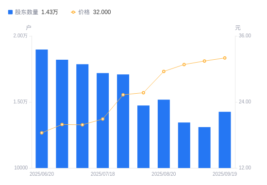 近一年(2024年9月20日至2025年9月19日),洁美科技A股股东户数从1.85万户,减低至1.43万户,降幅22.96%,区间股价上涨104.30%。