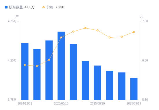 近一年(2024年9月30日至2025年9月19日),新农开发A股股东户数从4.74万户,减低至4.03万户,降幅15.02%,区间股价上涨14.22%。