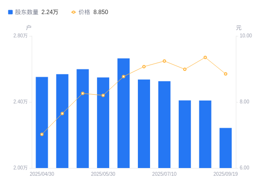 近一年(2024年9月30日至2025年9月19日),清水源A股股东户数从2.76万户,减低至2.24万户,降幅18.68%,区间股价上涨1.72%。