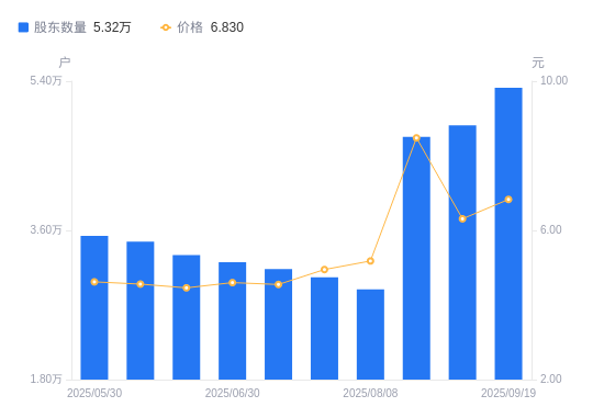 近一年(2024年9月20日至2025年9月19日),电子城A股股东户数从4.45万户,增加至5.32万户,增幅19.51%,区间股价上涨71.61%。