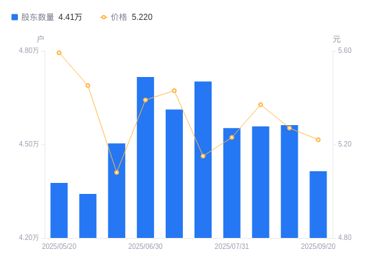 近一年(2024年9月30日至2025年9月20日),华锦股份A股股东户数从5.16万户,减低至4.41万户,降幅14.49%,区间股价上涨18.85%。
