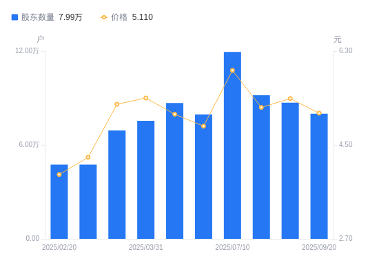 近一年(2024年9月30日至2025年9月20日),韶能股份A股股东户数从4.98万户,增加至7.99万户,增幅60.50%,区间股价上涨38.37%。