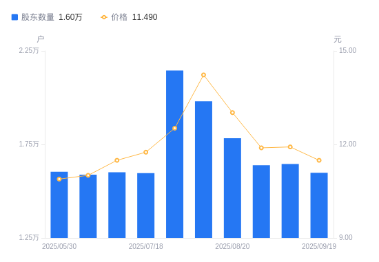 近一年(2024年9月30日至2025年9月19日),达嘉维康A股股东户数从1.57万户,增加至1.6万户,增幅1.75%,区间股价上涨16.44%。