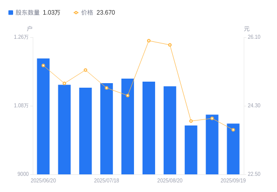 近一年(2024年9月20日至2025年9月19日),永泰运A股股东户数从1.13万户,减低至1.03万户,降幅8.60%,区间股价上涨44.95%。