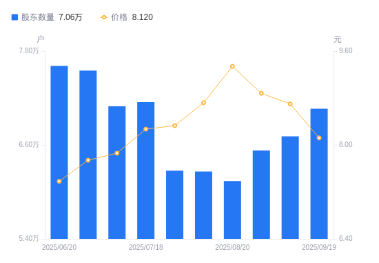 近一年(2024年9月20日至2025年9月19日),焦作万方A股股东户数从7.45万户,减低至7.06万户,降幅5.14%,区间股价上涨51.49%。