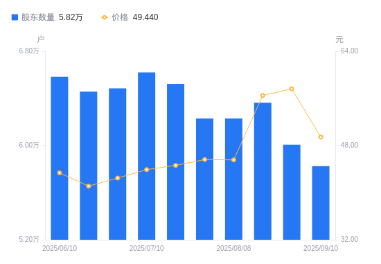 近一年(2024年9月20日至2025年9月19日),高新发展A股股东户数从9.74万户,减低至6.15万户,降幅36.82%,区间股价上涨37.00%。