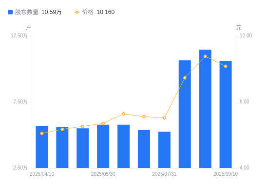 近一年(2024年9月30日至2025年9月19日),北纬科技A股股东户数从5万户,增加至12.89万户,增幅157.89%,区间股价上涨111.64%。