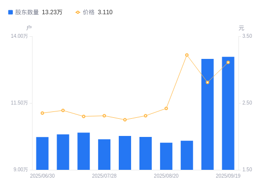 近一年(2024年9月30日至2025年9月19日),兆新股份A股股东户数从11.42万户,增加至13.23万户,增幅15.85%,区间股价上涨62.83%。