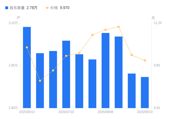 近一年(2024年9月20日至2025年9月19日),陇神戎发A股股东户数从2.95万户,减低至2.72万户,降幅7.59%,区间股价上涨36.83%。