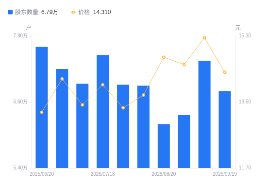 近一年(2024年9月20日至2025年9月19日),圣阳股份A股股东户数从4.83万户,增加至6.79万户,增幅40.53%,区间股价上涨124.65%。