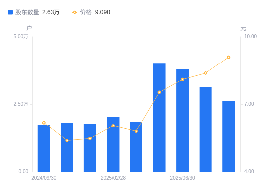 近一年(2024年9月30日至2025年9月19日),海默科技A股股东户数从1.73万户,增加至2.63万户,增幅52.13%,区间股价上涨63.78%。