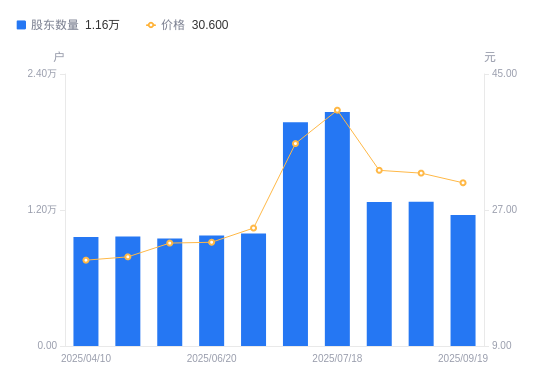 近一年(2024年9月30日至2025年9月19日),欣灵电气A股股东户数从1.07万户,增加至1.16万户,增幅7.93%,区间股价上涨60.38%。