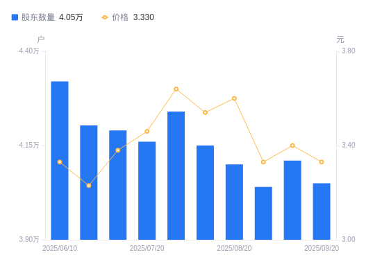 近一年(2024年9月30日至2025年9月20日),华仁药业A股股东户数从4.64万户,减低至4.05万户,降幅12.71%,区间股价上涨3.10%。