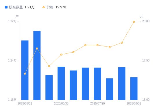 近一年(2024年9月30日至2025年8月31日),元利科技A股股东户数从1.35万户,减低至1.21万户,降幅10.69%,区间股价上涨43.62%。