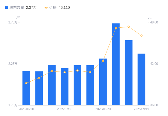 近一年(2024年9月20日至2025年9月19日),新媒股份A股股东户数从2.22万户,增加至2.37万户,增幅6.91%,区间股价上涨47.20%。