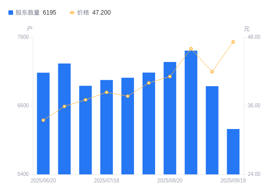 近一年(2024年9月20日至2025年9月19日),英华特A股股东户数从6404户,减低至6195户,降幅3.26%,区间股价上涨59.93%。