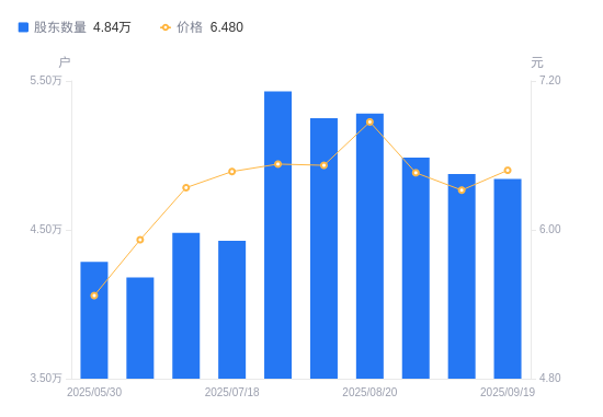 近一年(2024年9月20日至2025年9月19日),海德股份A股股东户数从2.42万户,增加至4.84万户,增幅100.00%,区间股价上涨36.71%。