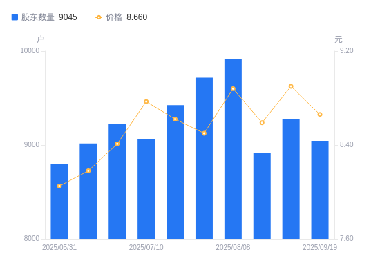 近一年(2024年9月30日至2025年9月19日),顶固集创A股股东户数从9636户,减低至9045户,降幅6.13%,区间股价上涨49.31%。