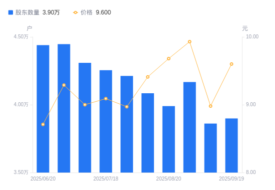 9月22日消息,数据显示,截至2025年9月19日,光韵达A股股东总户数为3.9万户,较上期(2025年9月10日)增加385户,增幅1.00%。公司最新A股总股本为5.44亿股,其中流通A股4.13亿股,户均持有流通A股数量为1.06万股,较上期减少105.52股,降幅0.99%;户均持流通A股市值10.16万元,较上期增加5612.8元,增幅5.85%。