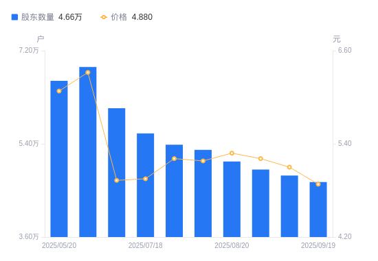 近一年(2024年9月30日至2025年9月19日),ST任子行A股股东户数从6.01万户,减低至4.66万户,降幅22.44%,区间股价上涨11.16%。