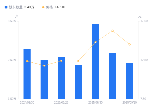 近一年(2024年9月30日至2025年8月8日),贵航股份A股股东户数从2.79万户,减低至2.68万户,降幅3.68%,区间股价上涨42.08%。