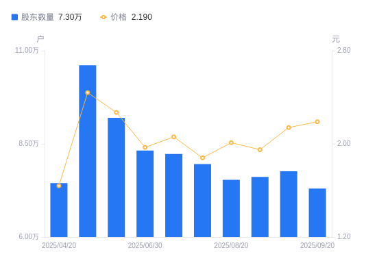 近一年(2024年9月20日至2025年9月10日),启迪环境A股股东户数从6.22万户,增加至7.76万户,增幅24.89%,区间股价上涨38.96%。