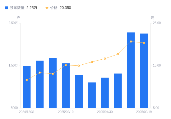 近一年(2024年9月30日至2025年9月19日),西菱动力A股股东户数从1.44万户,增加至2.25万户,增幅56.78%,区间股价上涨101.88%。