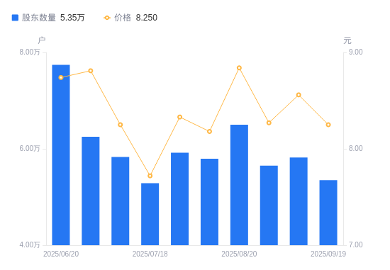 近一年(2024年9月20日至2025年9月19日),慈文传媒A股股东户数从3.98万户,增加至5.35万户,增幅34.42%,区间股价上涨61.13%。