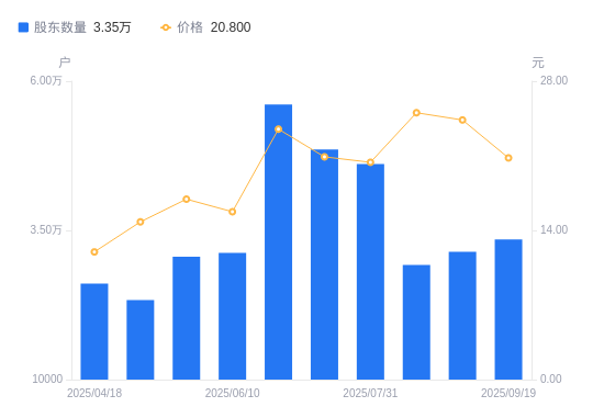 近一年(2024年9月20日至2025年9月19日),朗新集团A股股东户数从2.83万户,增加至3.35万户,增幅18.35%,区间股价上涨145.86%。