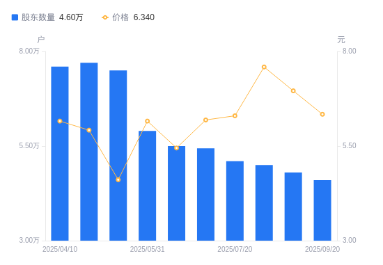 近一年(2024年9月20日至2025年9月20日),*ST椰岛A股股东户数从6.8万户,减低至4.6万户,降幅32.35%,区间股价下跌8.25%。