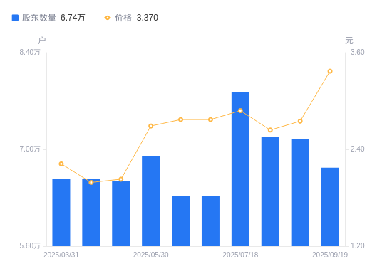 近一年(2024年9月30日至2025年9月19日),金浦钛业A股股东户数从6.61万户,增加至6.74万户,增幅1.83%,区间股价上涨58.22%。