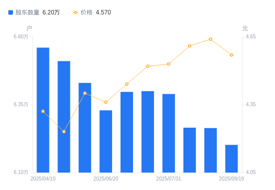 近一年(2024年9月20日至2025年9月19日),贵州轮胎A股股东户数从6.04万户,增加至6.2万户,增幅2.64%,区间股价上涨7.50%。