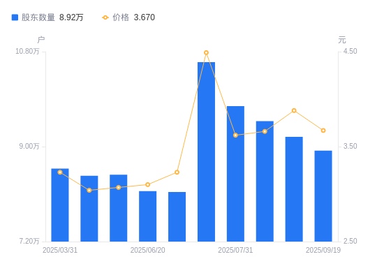 近一年(2024年9月20日至2025年9月19日),拓日新能A股股东户数从8.97万户,减低至8.92万户,降幅0.50%,区间股价上涨26.55%。