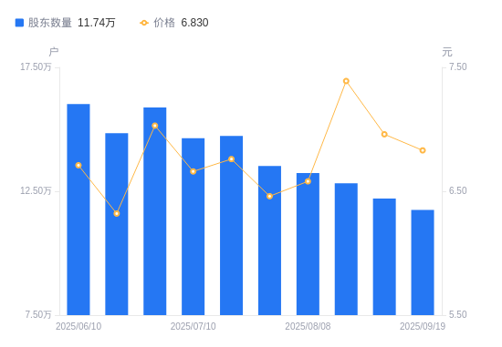 近一年(2024年9月30日至2025年9月19日),天汽模A股股东户数从6.8万户,增加至11.74万户,增幅72.74%,区间股价上涨69.48%。