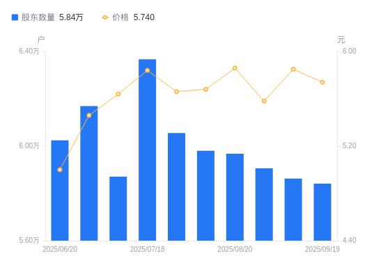 近一年(2024年9月30日至2025年9月10日),双星新材A股股东户数从7.17万户,减低至5.86万户,降幅18.21%,区间股价上涨13.81%。