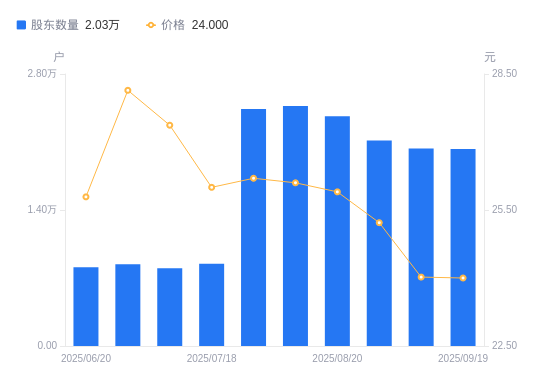 近一年(2024年9月20日至2025年9月19日),壶化股份A股股东户数从1.19万户,增加至2.03万户,增幅69.72%,区间股价上涨79.09%。