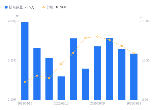 近一年(2024年9月30日至2025年9月19日),道道全A股股东户数从2.4万户,减低至2.39万户,降幅0.24%,区间股价上涨61.99%。
