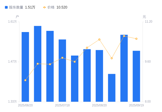 近一年(2024年9月20日至2025年9月19日),泰瑞机器A股股东户数从1.85万户,减低至1.51万户,降幅18.66%,区间股价上涨47.96%。