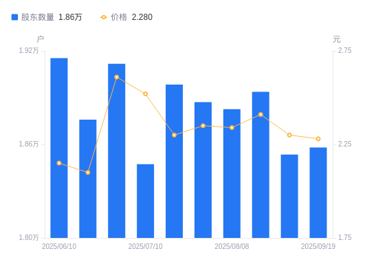 近一年(2024年9月30日至2025年9月19日),ST长方A股股东户数从2.21万户,减低至1.86万户,降幅15.99%,区间股价上涨75.38%。